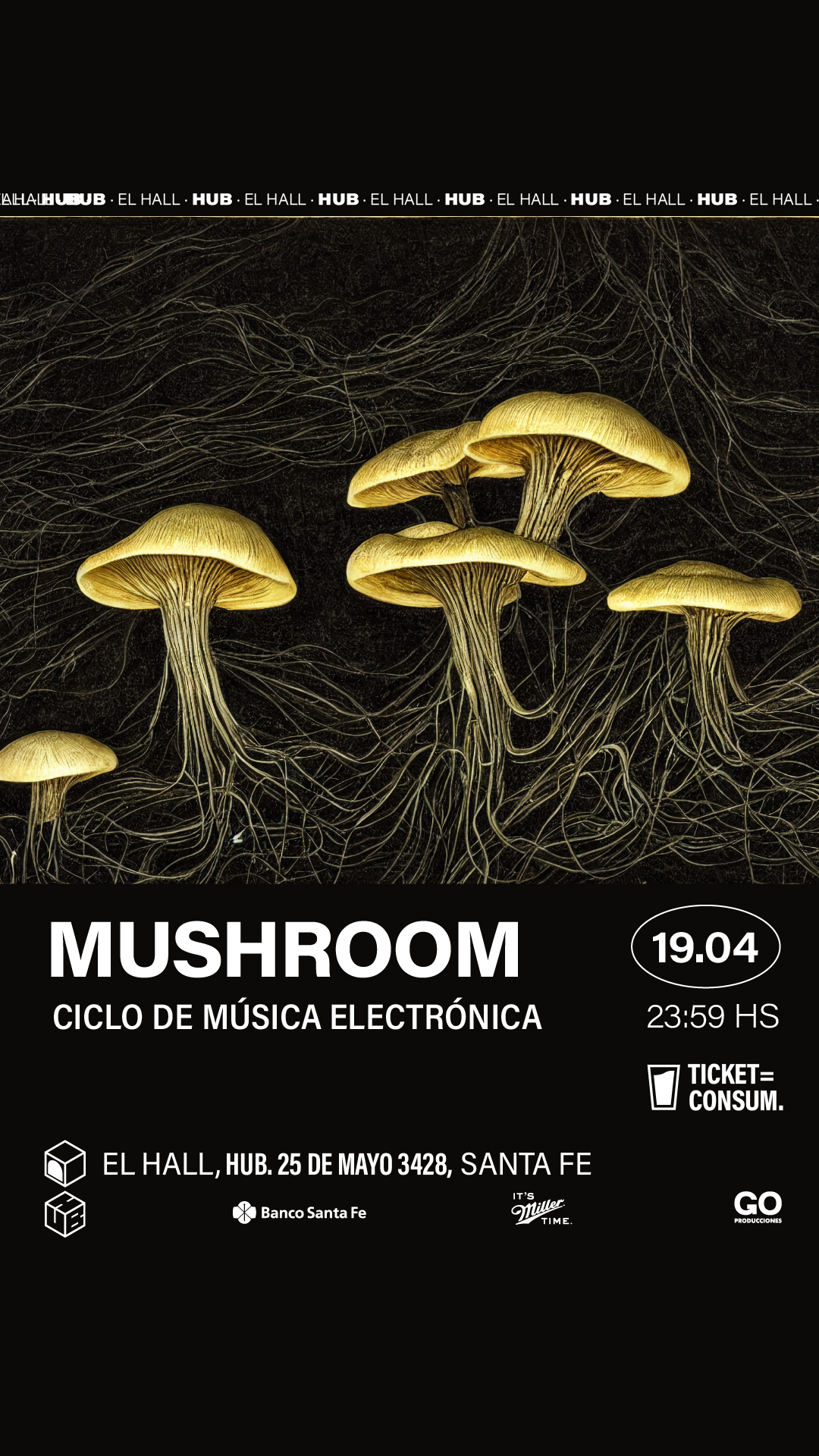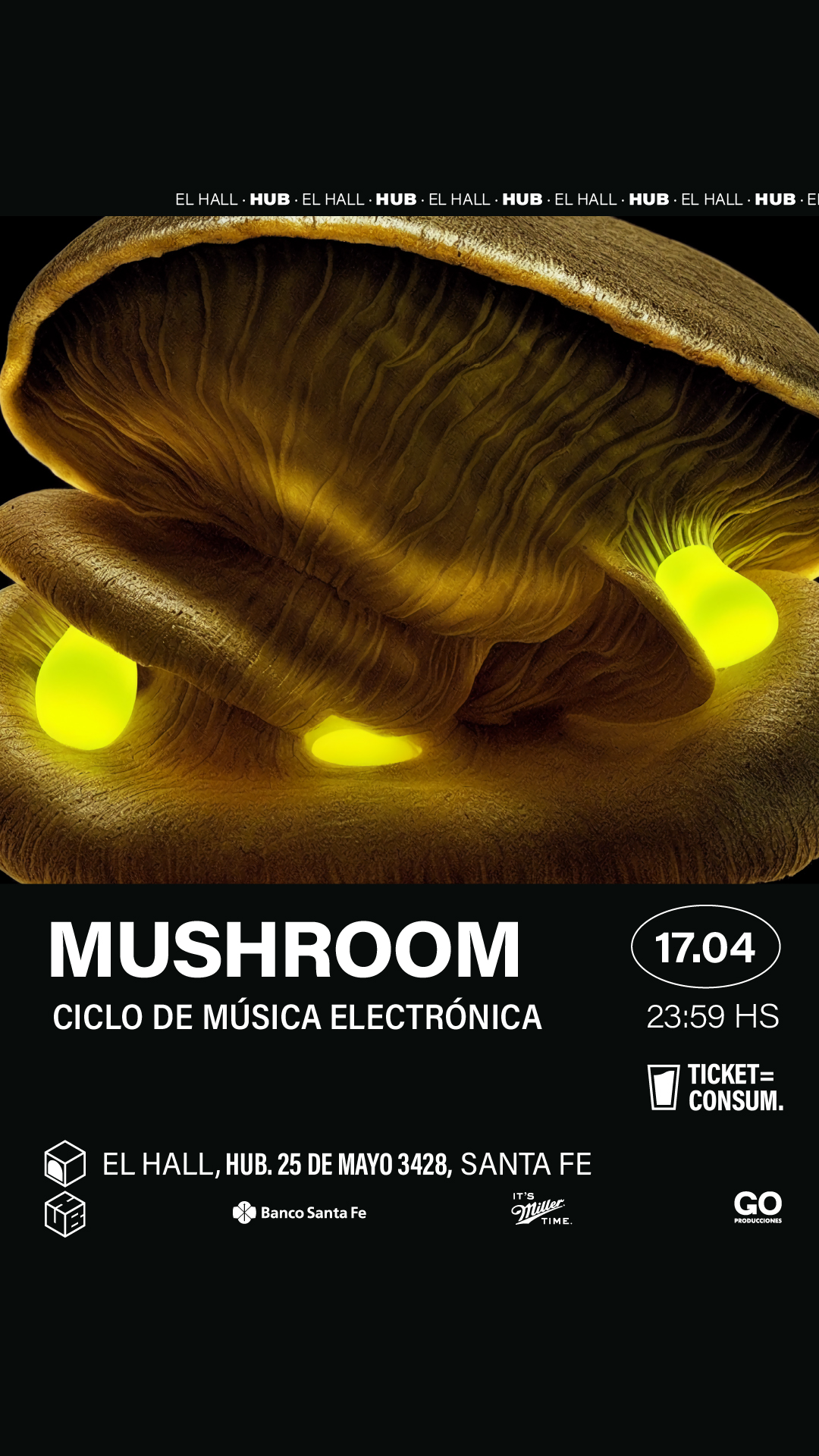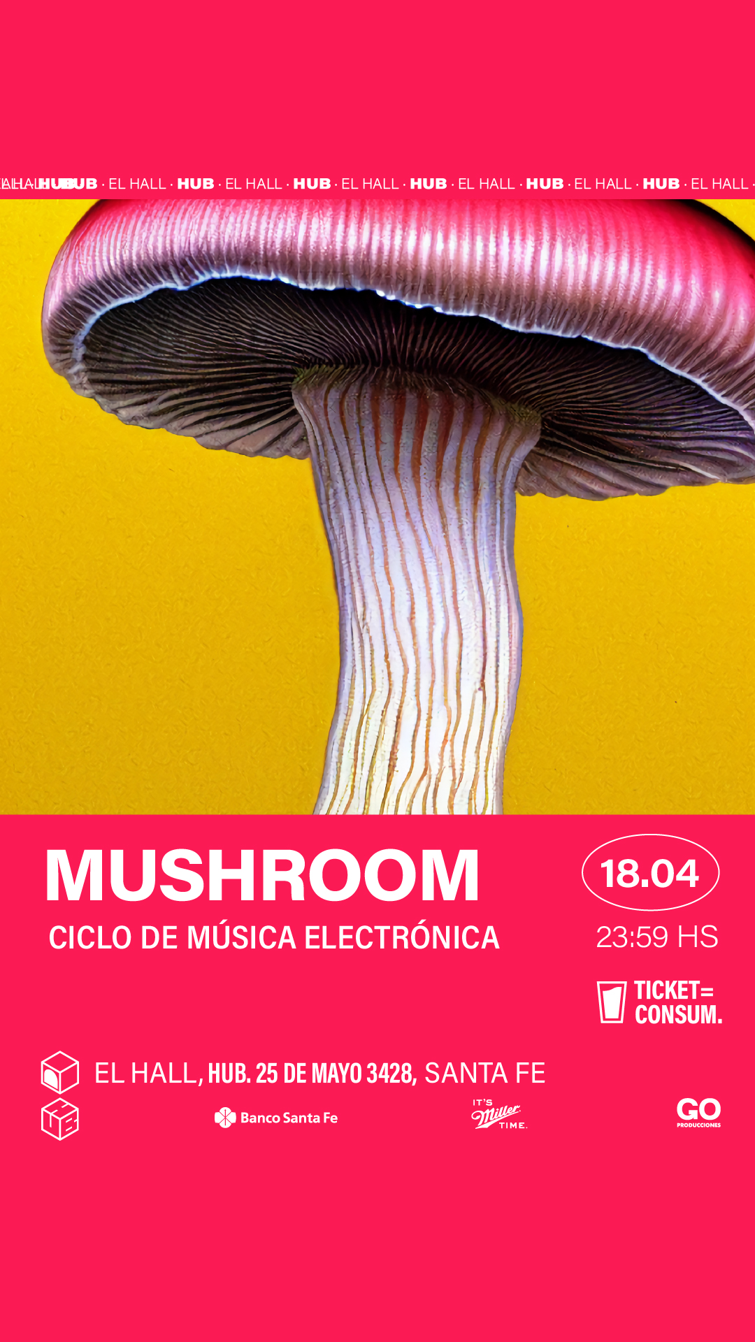 VIERNES 18 DE ABRIL A LAS 23.59 HS: Una nueva edición de Mushroom (Club de Amigos & Música Electrónica) llega para vivir las mejores trasnoches en El Hall. Adquirí tu entrada válida por una consumición en HUB.