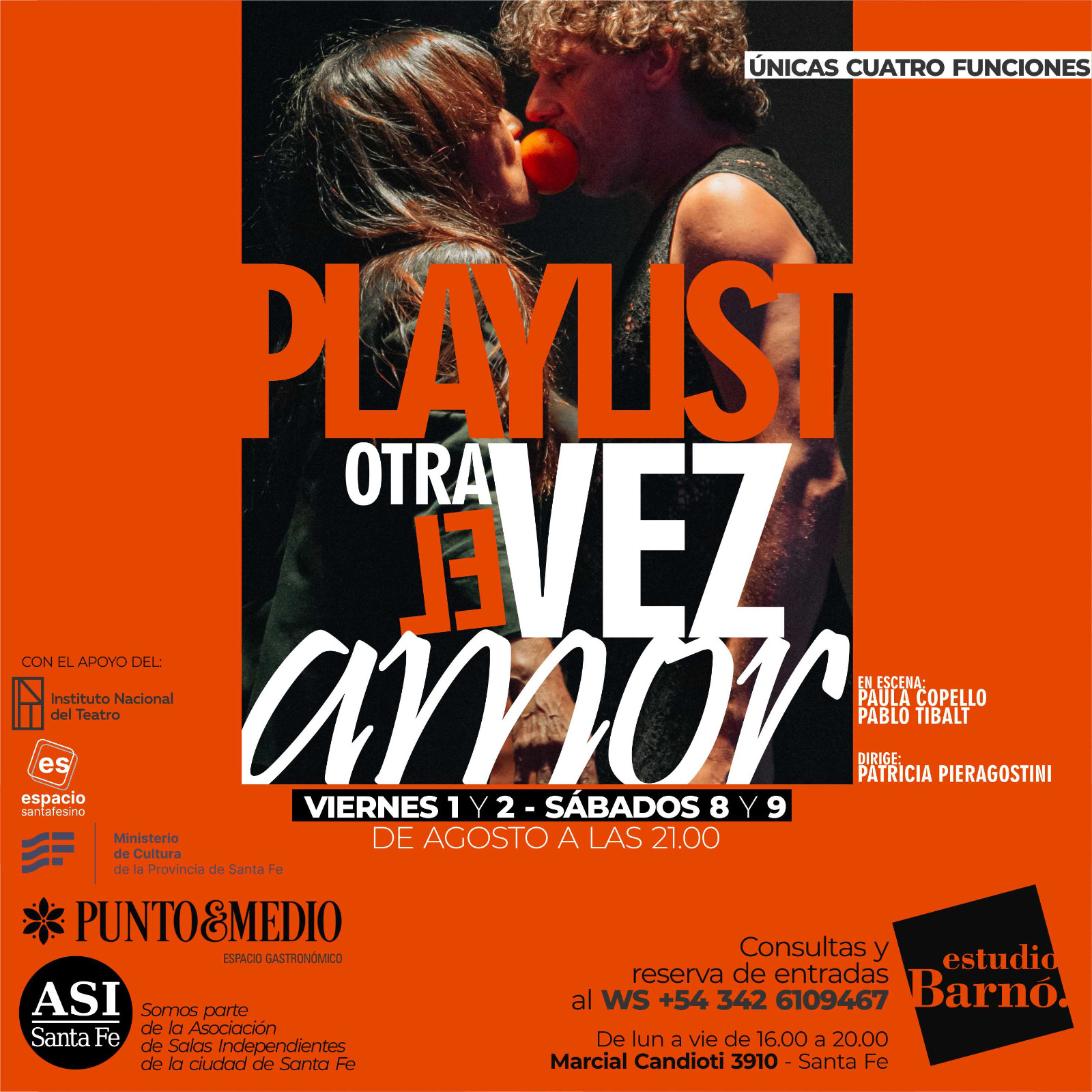 Nuevas funciones de "Playlist, otra vez el amor". Cuatro únicas presentaciones: Viernes 1 y 8 - sábados 2 y 9 de agosto a las 21.00Hs. ¿Vos me querés o no me querés? “Todas las canciones hablan de nosotros” ¿Sos mi media naranja o la naranja completa que voy a abrir por la mitad? Las entradas están a la venta de lun a vie de 16.00 a 20.00Hs al 342 6109467.