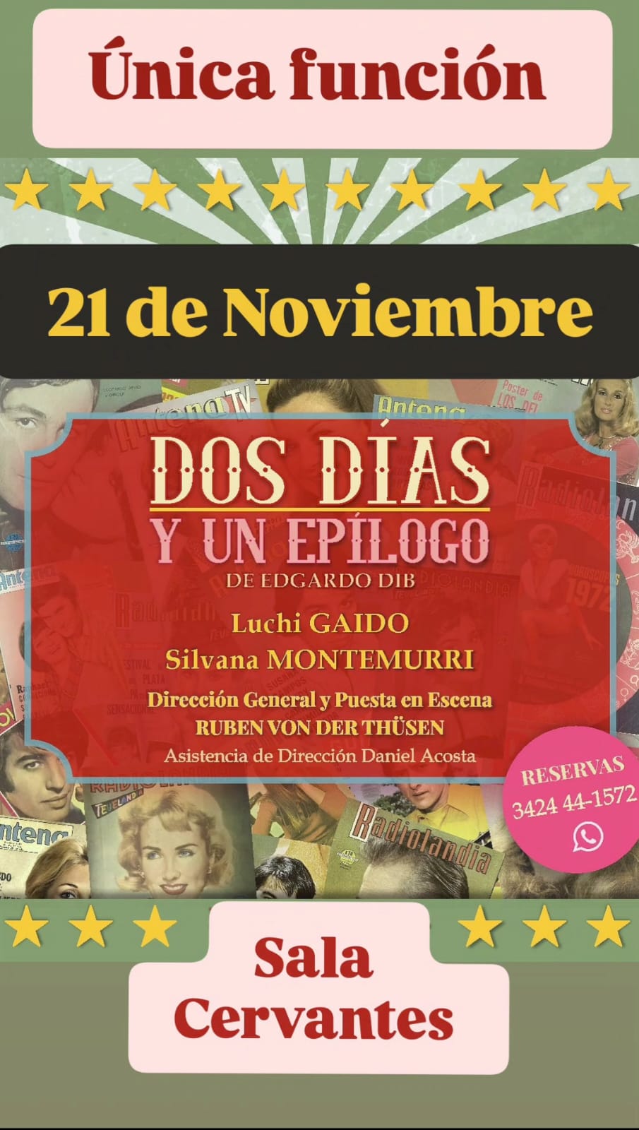 Se presentará la obra “Dos días y un epílogo”. Sobre la obra: Mediados de los años 70. Dos hermanas mayores. Bianca regresa a la casa familiar, La Casa de las Rosas, donde vive Renata. Las charlas al horario del desayuno hilvanan la trama, plagadas de recuerdos y secretos, mientras una construcción/demolición sucede tras la medianera.