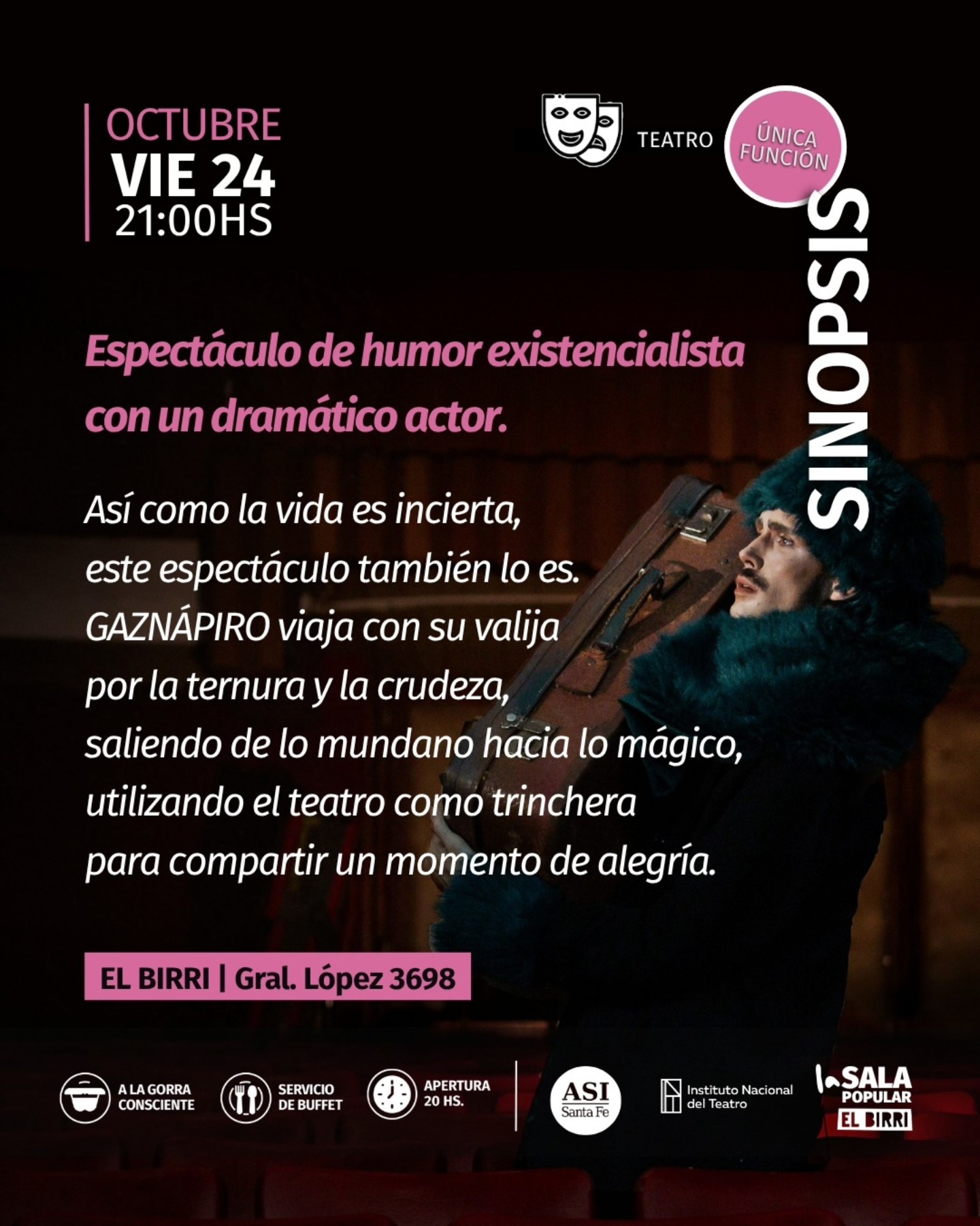 GAZNÁPIRO viaja con su valija por la ternura y la crudeza, saliendo de lo mundano hacia lo mágico, utilizando el teatro como trinchera para compartir un momento de alegría.