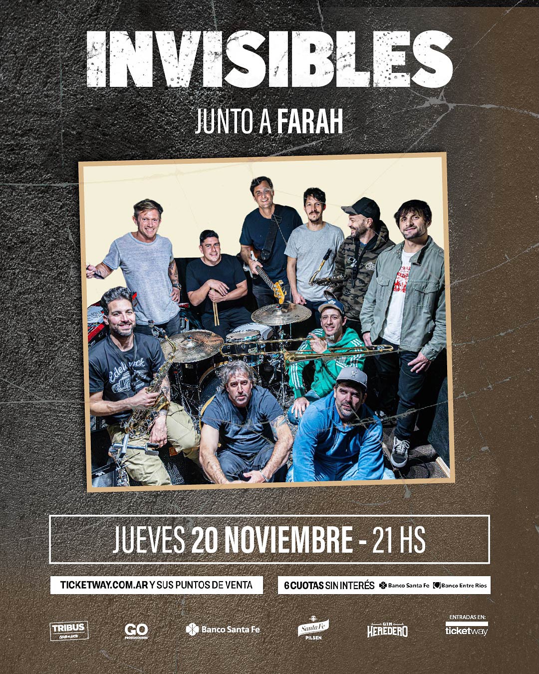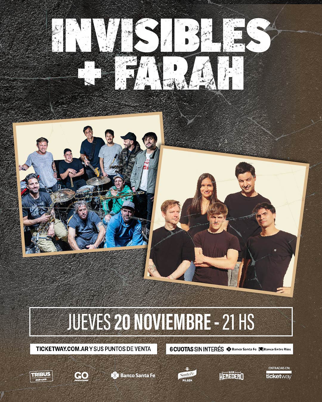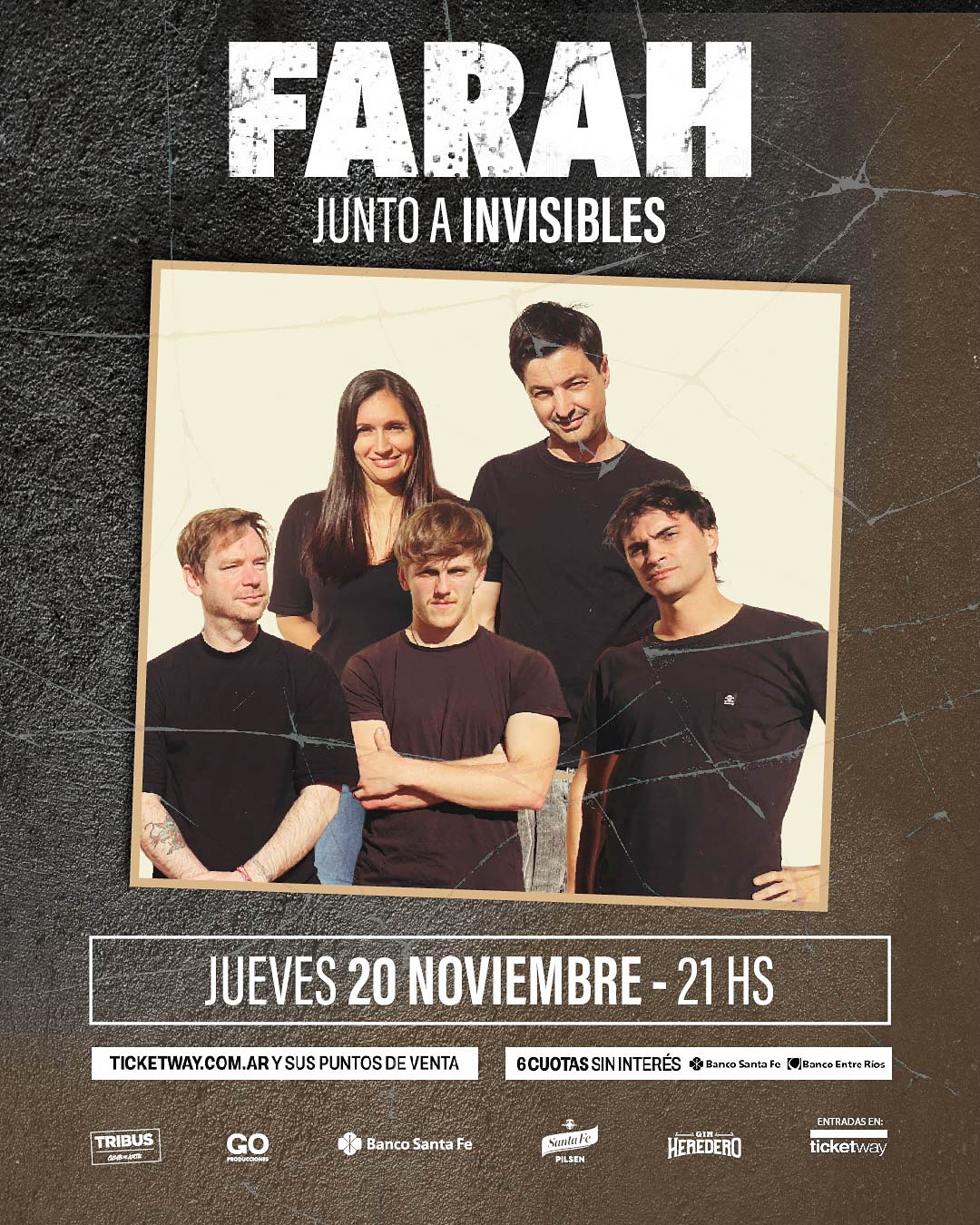 Farah e Invisibles se presentarán en Tribus Club de Arte el jueves 20 de noviembre a las 21Hs. Las entradas están a la venta en boletería de Tribus y a través de Ticketway (puntos de venta online y físicos).