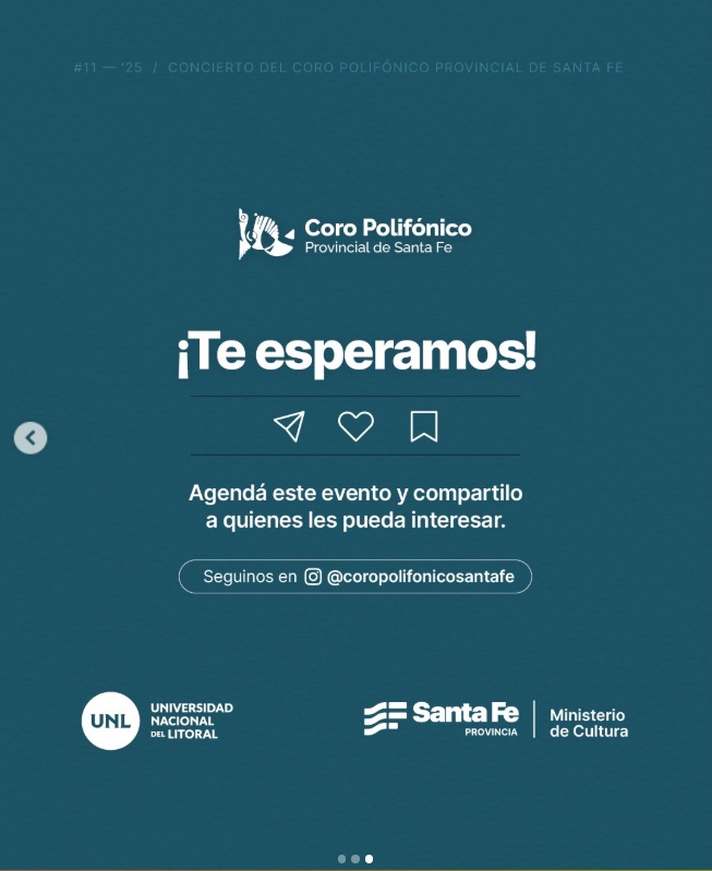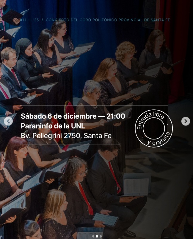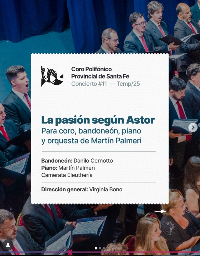 La Pasión Según Astor para Coro, Bandoneón, piano y orquesta de Martín Palmeri. Bandoneón: Danilo Cernotto. Piano: Martín Palmeri. Camerata Eleuthería. Dirección general: Virginia Bono. Sábado 6 de diciembre a las 21Hs.en el Paraninfo de la UNL. Bv. Pellegrini 2750, Santa Fe. Entrada libre y gratuita (por orden de llegada). #santafe #cultura.