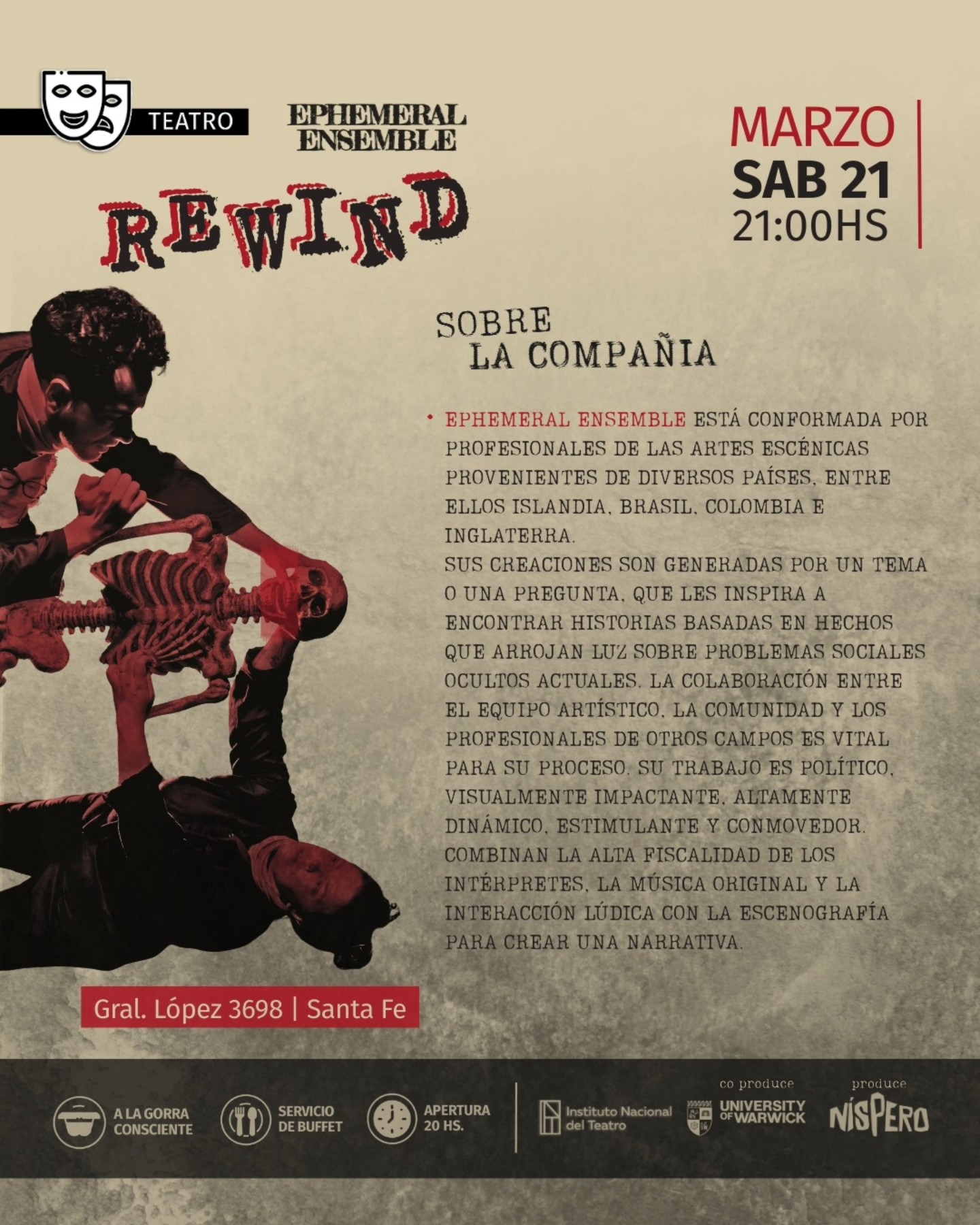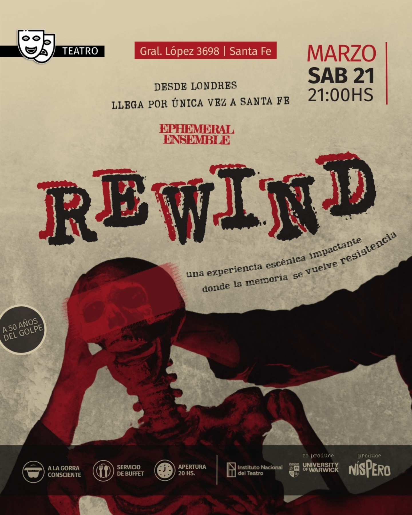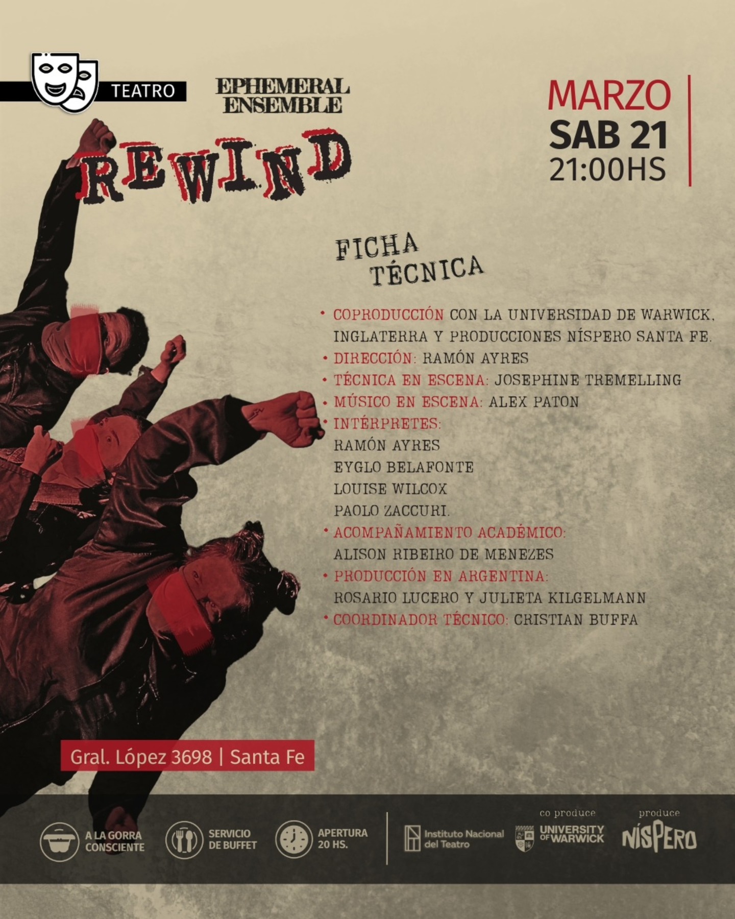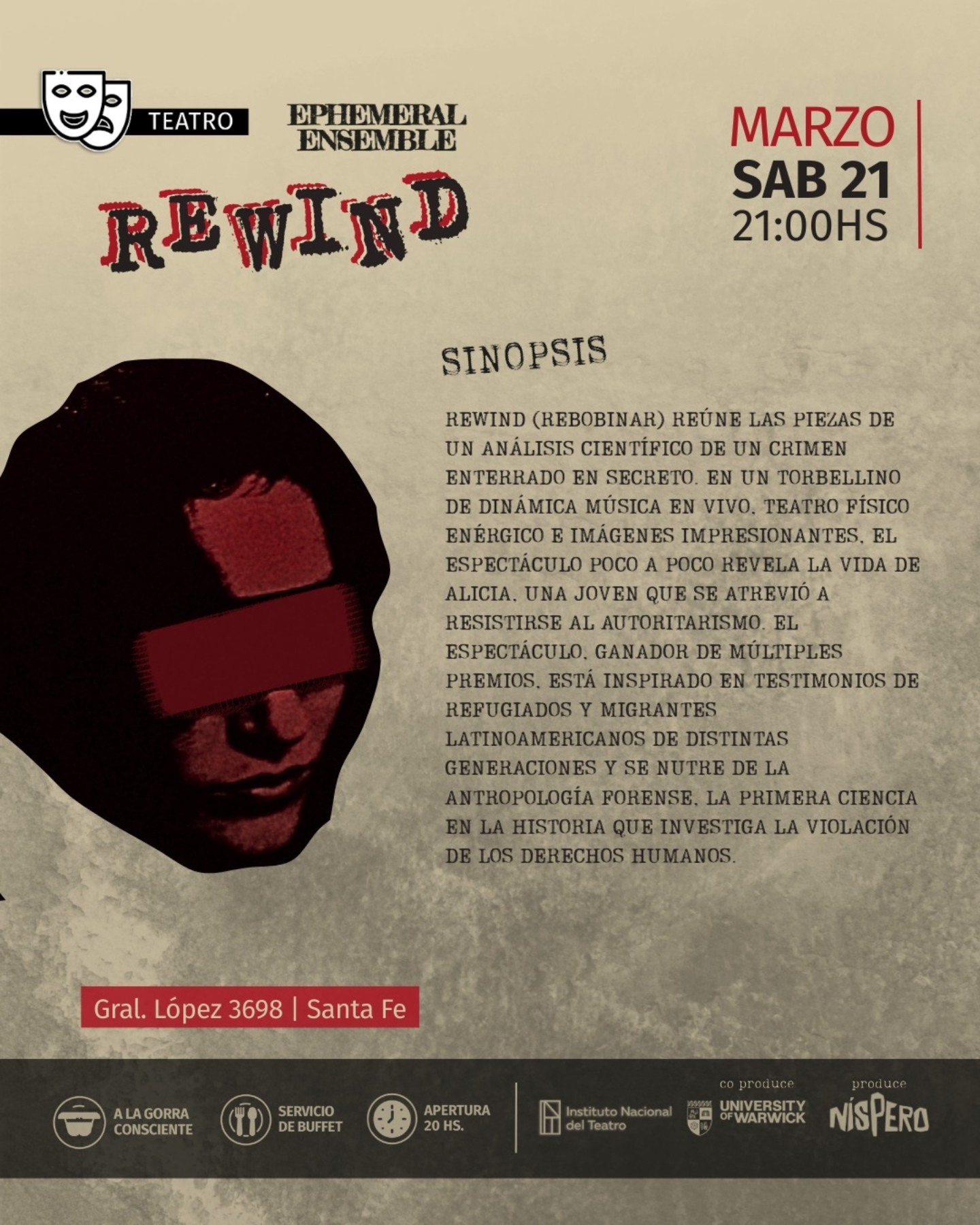 Desde Inglaterra llega "Rewind" / "Ephemeral Ensemble" Londres | Este sábado 21 de amrzo a las 21Hs en Gral.López 3698. Una experiencia escénica impactante donde la memoria se vuelve un acto vivo de resistencia frente al terrorismo de estado. / Teatro físico.