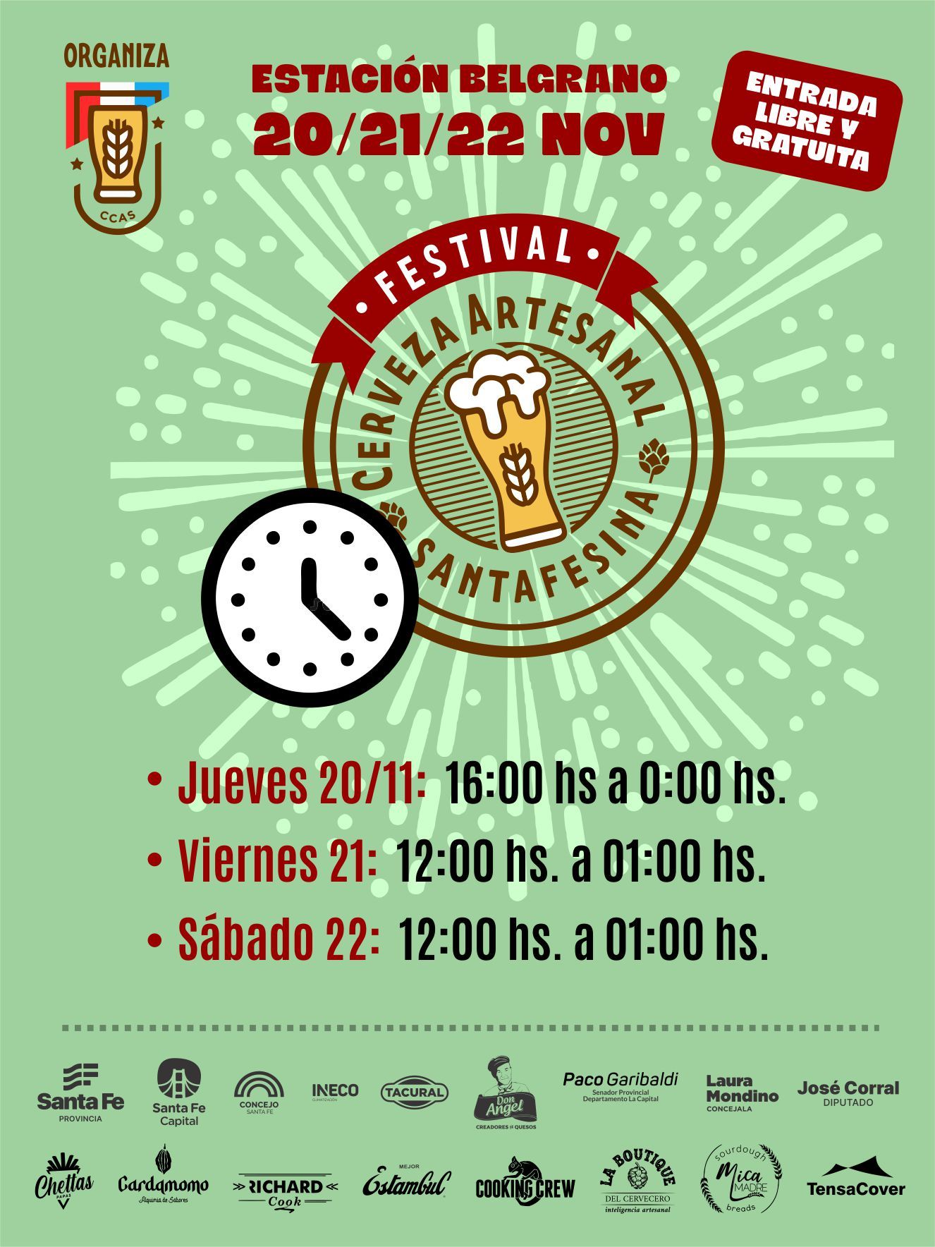 El festival de las cervecerías artesanales de Santa Fe llega a la Estación Belgrano. El Festival de la Cerveza Artesanal Santafesina arranca en la previa del fin de semana largo: será los días 20, 21 y 22 de noviembre en el estacionamiento de Bulevar Gálvez y Avellaneda con entrada libre y gratuita. Organiza la Cámara de Cerveceros Artesanales de Santa Fe.