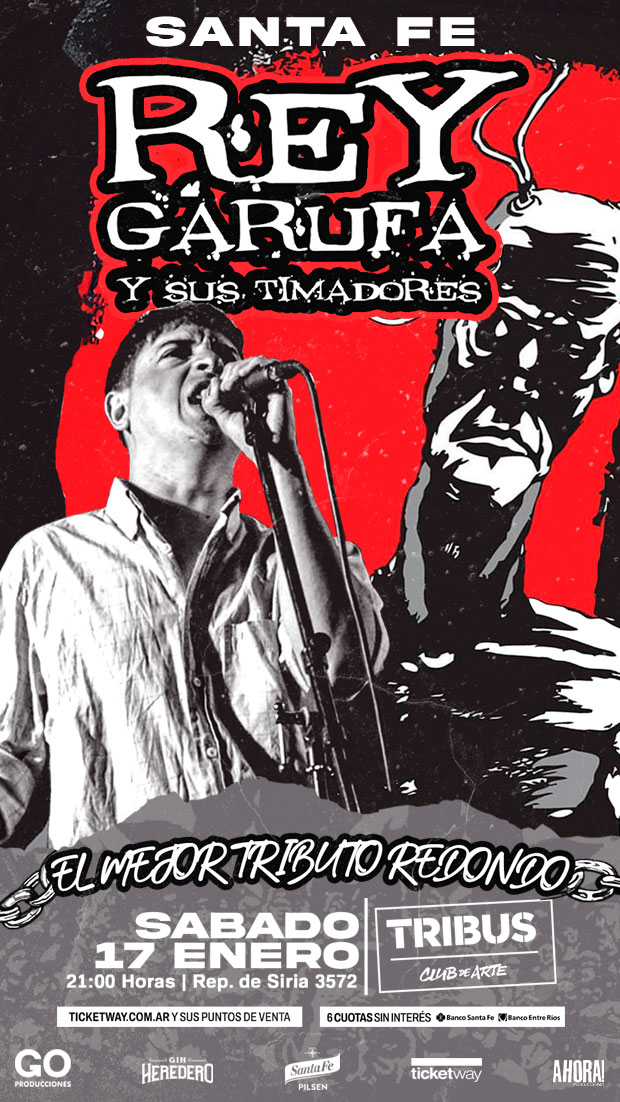 Rey Garufa, el mejor tributo Redondo, regresa a Tribus. Rey Garufa (Tributo a Patricio Rey y sus Redonditos de Ricota) se presentará en Tribus Club de Arte el sábado 17 de enero a las 21Hs. Las entradas están a la venta en boletería de Tribus y a través de Ticketway.