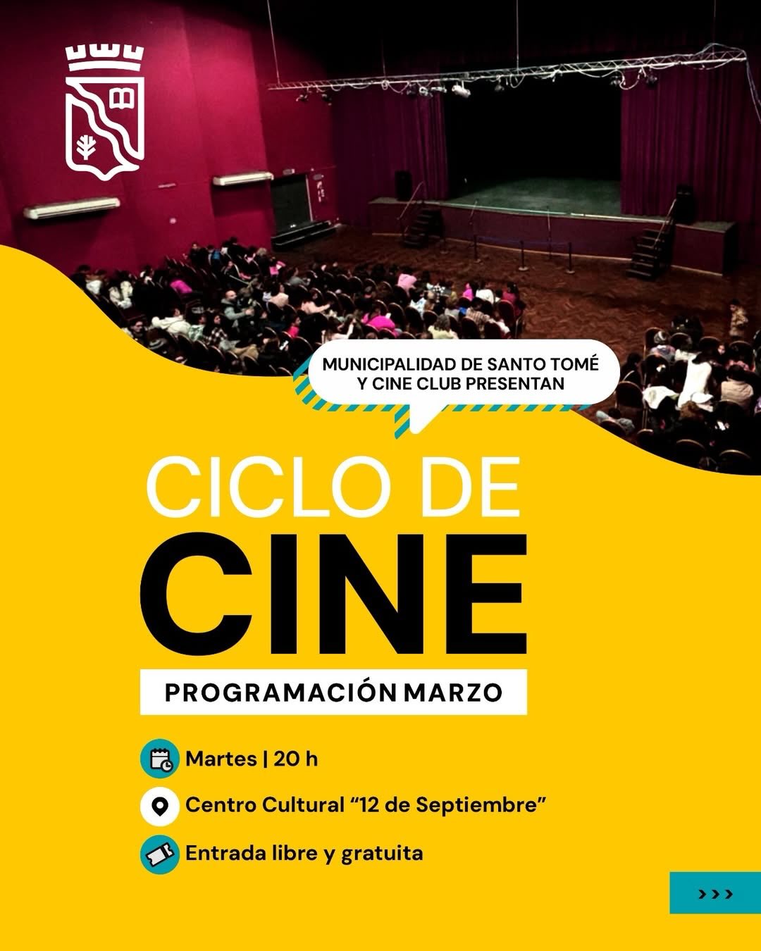 Ciclo de #Cine | Funciones de #marzo. La propuesta, organizada por la Municipalidad de Santo Tomé junto al Cine Club Santa Fe, presenta tres nuevas funciones para disfrutar en pantalla grande durante los próximos martes. Centro Cultural “12 de Septiembre”. Martes 17/03, 24/03 y 31/03 Desde las 20Hs. Entrada libre y gratuita. Consultá la cartelera en las imágenes de esta publicación. ¡Los esperamos!